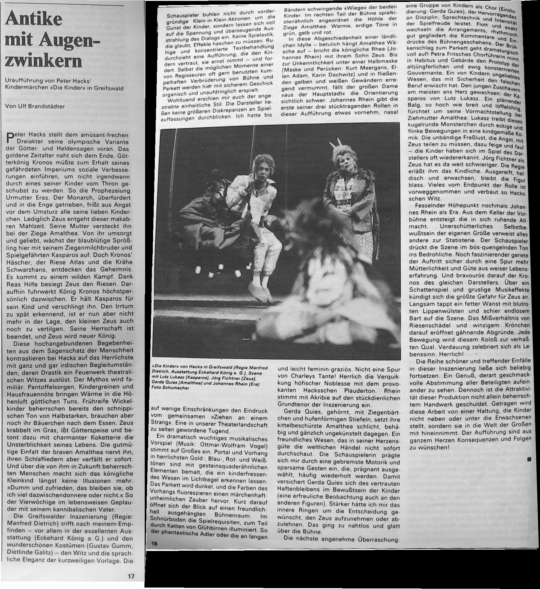 "Antike mit Augenzwinkern" Uraufführung von Peter Hacks Kindermärchen "Die Kinder" in Greifswald von Ulf Brandstädter Theater der Zeit 4/1984